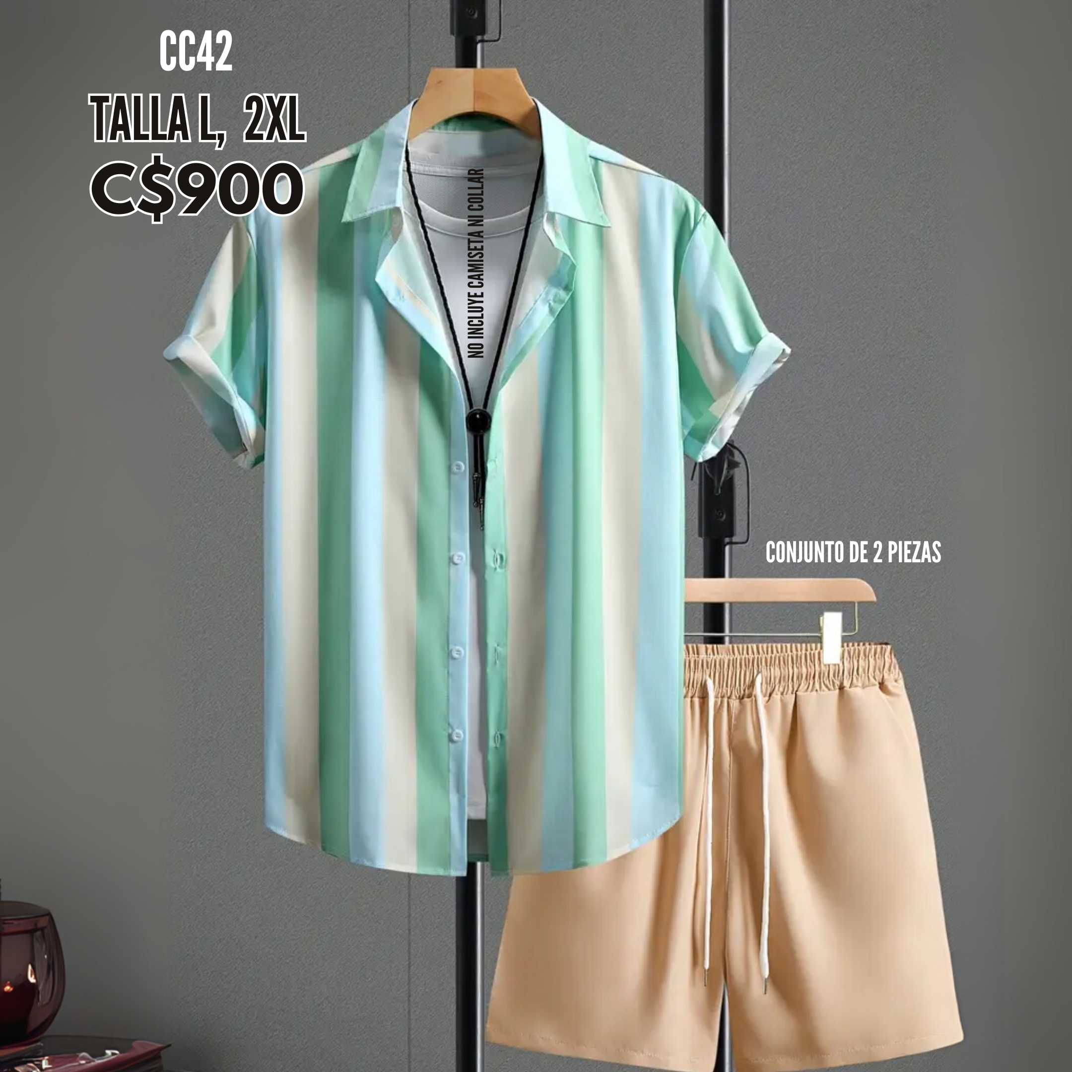 Conjunto camisa de vestir verde, amarillo, celeste con shorts crema